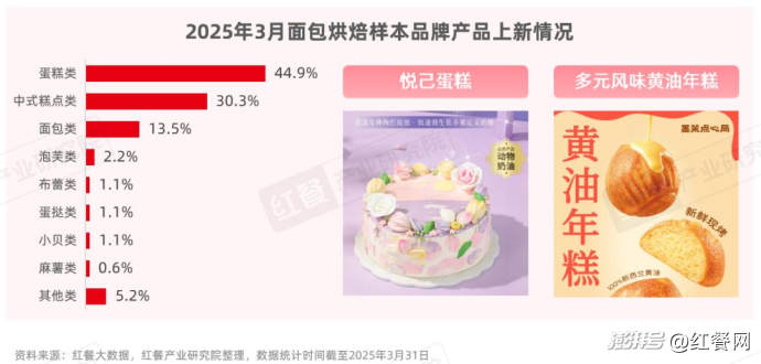 2025年3月,面包烘焙新品涵蓋的類別較豐富,有蛋糕類、中式糕點類、面包類、其他類等9種類型。其中,蛋糕類新品數量最多,3月共推出80款,占面包烘焙新品總數的44.9%;其次是中式糕點類,共上架54款新品,占新品總數的30.3%。