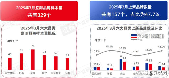 為洞悉餐飲行業產品上新發展趨勢,紅餐產業研究院選取了餐飲行業具有代表性的六個品類作為監測對象,包括西式快餐、粉面、茶飲、咖飲、面包烘焙、火鍋這六大品類。紅餐產業研究院監測的品牌樣本量一共有329個,2025年3月六大品類中共有157個品牌推出新品,占監測品牌樣本量的47.7%。