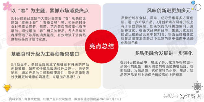 總體而言,2025年3月六大品類的新品數量環比顯著提升,同時各大品牌通過緊抓春季上新熱度、升級基礎食材、風味升級、多品類融合等方面多元創新,為消費者帶來了新鮮體驗。