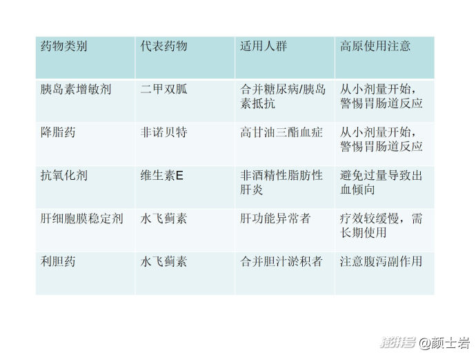 當生活方式干預3-6個月效果不佳,或患者已存在明顯肝損傷(如ALT持續升高、出現纖維化)時,可考慮在醫生指導下加用藥物治療。高原地區用藥需特別注意藥物的安全性和耐受性,以下為常用藥物類別: