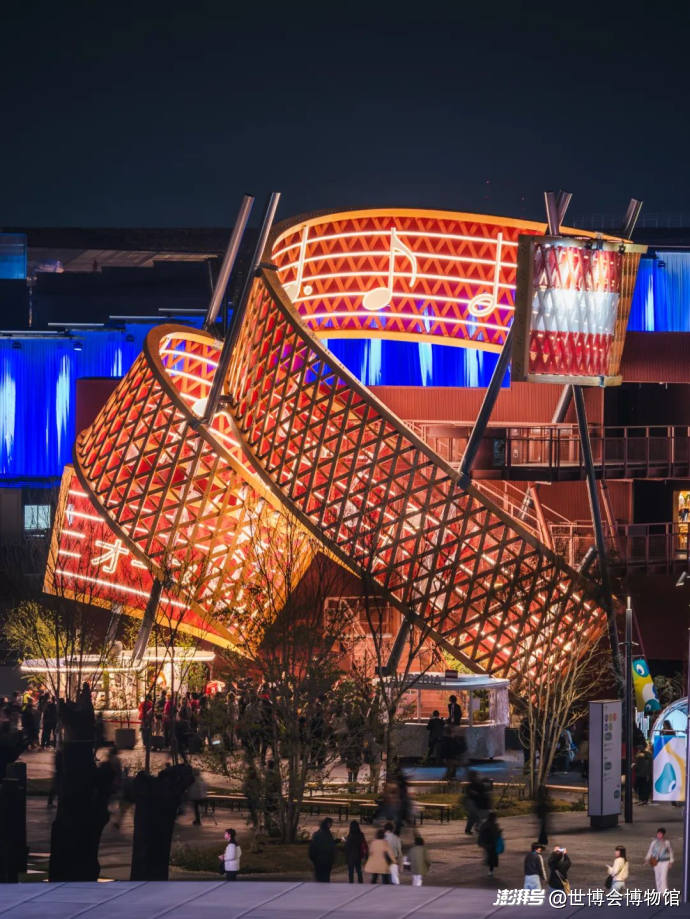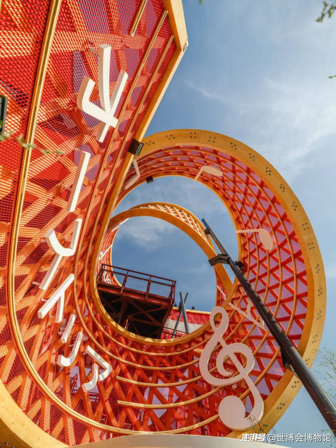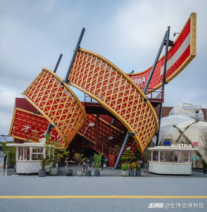 奧地利館巧妙運用音樂藝術元素,將其國旗標志性的紅白條紋幻化為躍動的巨型樂譜線條。建筑采用螺旋上升的流線造型,配合精心設計的傾斜曲面,打破了傳統建筑的封閉感,完美再現了音符在空中舞動的韻律之美。這座充滿樂感的建筑以親切的尺度感,引領參觀者步入一個由建筑譜寫的音樂世界。