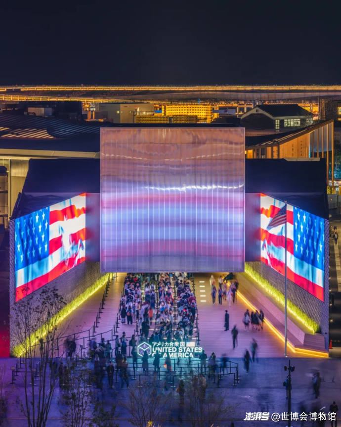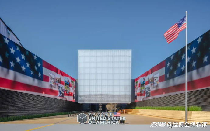 美國館以展開的"雙翼"造型環抱中心廣場,通過360度環繞的LED巨幕呈現美國多元的自然與城市景觀。參觀者穿行于仿若自然峽谷的廣場空間,身臨其境地感受美國大地的壯美風光。廣場核心區域懸置著一個半透明的反光立方體裝置,為觀眾提供了一處靜思人與自然、都市與生態共生關系的冥想空間。該館在建設中積極踐行聯合國可持續發展理念,特別采用了東京奧運會的回收建材,體現了資源循環利用的環保主張。