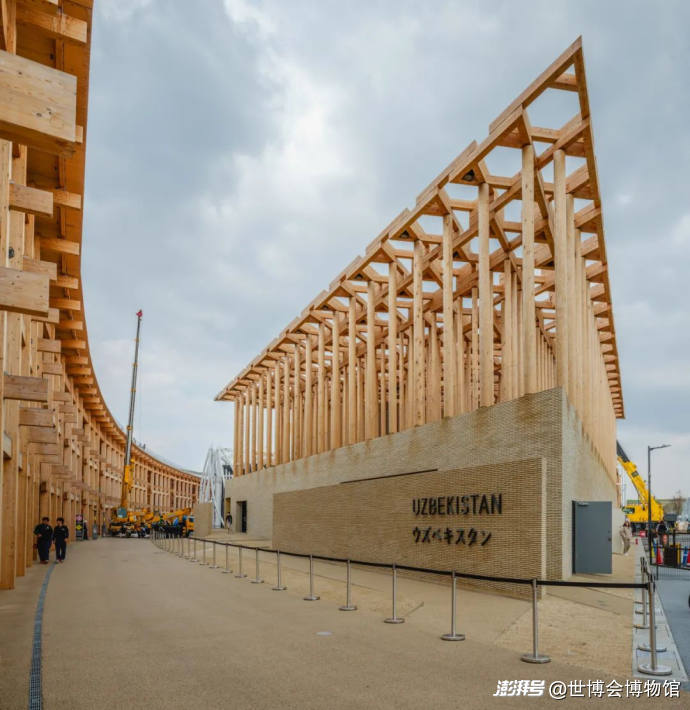 烏茲別克斯坦館呈現了一場關于建筑可循環利用的生動實踐。展館采用模塊化木構件體系建造,在世博會后將被完整拆卸,運回國內改造成創意工坊或教育空間。其設計融合三大核心要素:展現烏國自然風貌的景觀庭院、靈感源自傳統手工藝的木構柱陣,以及寓意文化傳承與當代創新的中心藝術裝置。