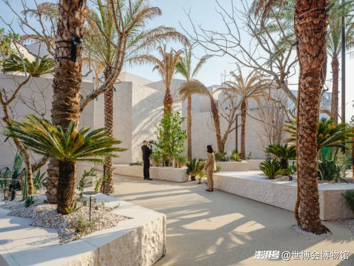 福斯特建筑事務所的設計靈感源自沙特遼闊的沙漠景觀,運用流體力學原理精心規劃了自然通風系統,打造出具有傳統沙特村落特色的展館群落。建筑外立面采用輕盈的當地石材覆層,錯落有致的疊層結構自然形成了蜿蜒的小徑與庭院空間。參觀者首先穿過一片郁郁蔥蔥的沙特本土植物前庭,隨后沿著幽靜的巷道漫步,最終抵達用于展覽和文化演出的中央庭院。