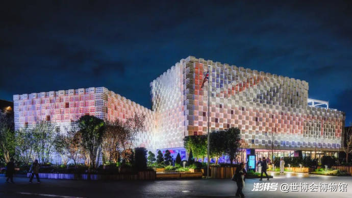 英國館以鮮明的幾何模塊造型,向可編程技術的發展歷程致敬——從古老的穿孔卡片、紡織機械到現代二進制編碼,這一設計巧妙串聯起英國引以為傲的紡織工業傳統與其在電子游戲、數字設計和系統思維等前沿領域的領先優勢。建筑外立面采用折疊穿孔鋁板打造的像素化幕墻,白天隨著光線角度變換呈現微妙的光影韻律,入夜后則神奇地幻化為閃耀的米字旗圖案,將科技與愛國情懷完美融合。
