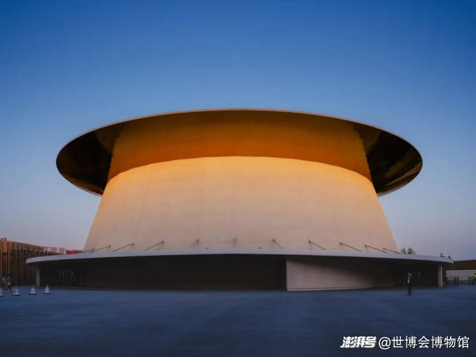 作為世博會重要慶典活動的主會場,Expo Hall以其獨特的建筑造型成為矚目焦點。這座白色錐形建筑最引人注目的設計亮點,是其頂部展開的金色圓盤狀屋頂結構——"Shining Hat"。這一設計靈感來源于1970年大阪世博會標志性的"太陽之塔",通過精心設計的光學反射效果,在特定角度和光線條件下,金色屋頂會產生直沖云霄的視覺幻象,為建筑增添了震撼的視覺效果。