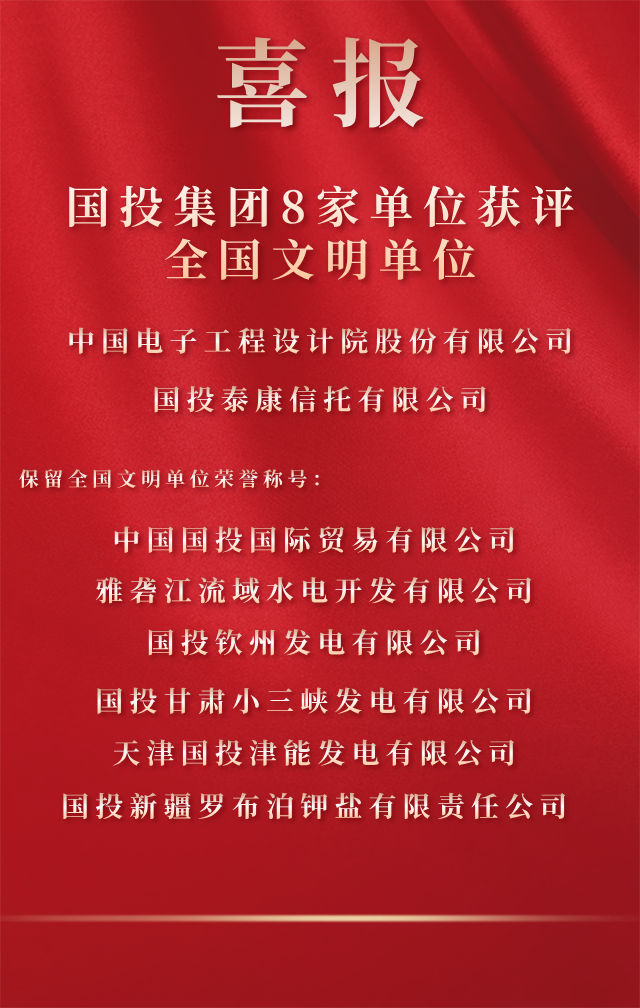 2025年5月23日,全國精神文明建設表彰大會在京召開,中央宣傳思想文化工作領導小組發布了關于認定命名第七屆全國文明城市、文明村鎮、文明單位和第三屆全國文明家庭、文明校園的決定,其中,授予4688個單位全國文明單位稱號。經國投集團推薦,中國電子院獲評全國文明單位。