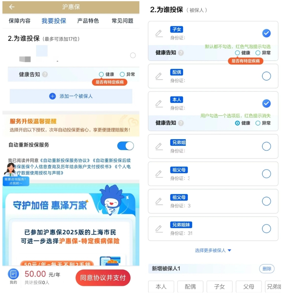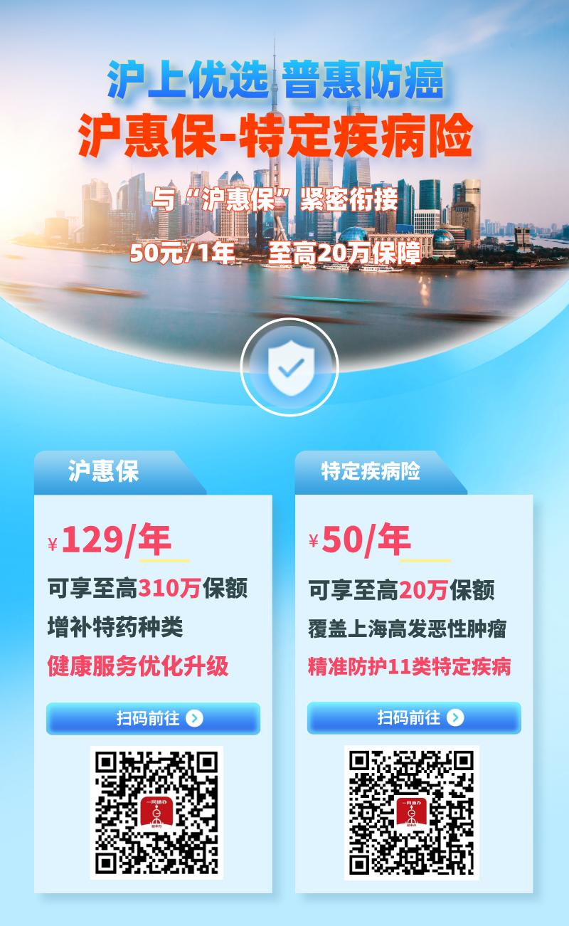新產(chǎn)品“滬惠保-特定疾病保險(xiǎn)”于5月27日正式發(fā)布。作為“滬惠保”系列產(chǎn)品,保持普惠特性,保費(fèi)50元/人、投保不限戶(hù)籍、不限年齡(須填寫(xiě)健康告知并經(jīng)核保)、理賠無(wú)等待期,支持使用醫(yī)保個(gè)賬為自己及符合參保資格的家庭成員,如配偶、父母、子女、兄弟姐妹、祖父母、外祖父母、孫子女、外孫子女共同投保。每天不到2毛錢(qián),即可享至多20萬(wàn)醫(yī)療保障!而且還是定額給付保障! 如果您在上海工作生活,那么“129元+50元”的雙保組合拳(2025版滬惠保+特定疾病保險(xiǎn)),將為您從大病報(bào)銷(xiāo)到特病特藥搭建出一份較為全面的安全保障,為您和家人的滬上健康生活托底!