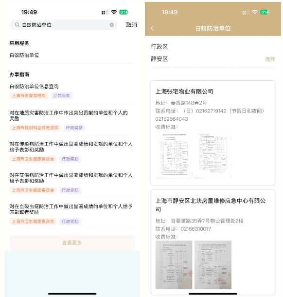 注冊(cè)登錄“隨申辦市民云”APP,在首頁(yè)搜索欄中輸入“白蟻防治單位”,可按行政區(qū)查詢(xún)白蟻防治企業(yè)。