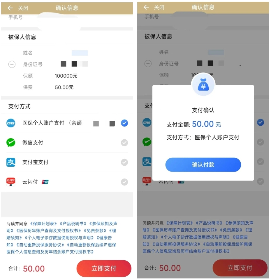 第三步:進(jìn)入付款界面后,選擇付款方式,并支付保費(fèi)。 以“醫(yī)保個(gè)人賬戶(hù)支付”舉例:支付方式點(diǎn)選“醫(yī)保個(gè)人賬戶(hù)支付”→點(diǎn)擊頁(yè)面底部的“立即支付”→確認(rèn)彈窗中被保人有無(wú)大病就診記錄,及相應(yīng)的報(bào)銷(xiāo)比例等提示信息。確認(rèn)后,點(diǎn)擊“已知曉,同意投保”→點(diǎn)擊“確認(rèn)付款”,完成保費(fèi)支付。