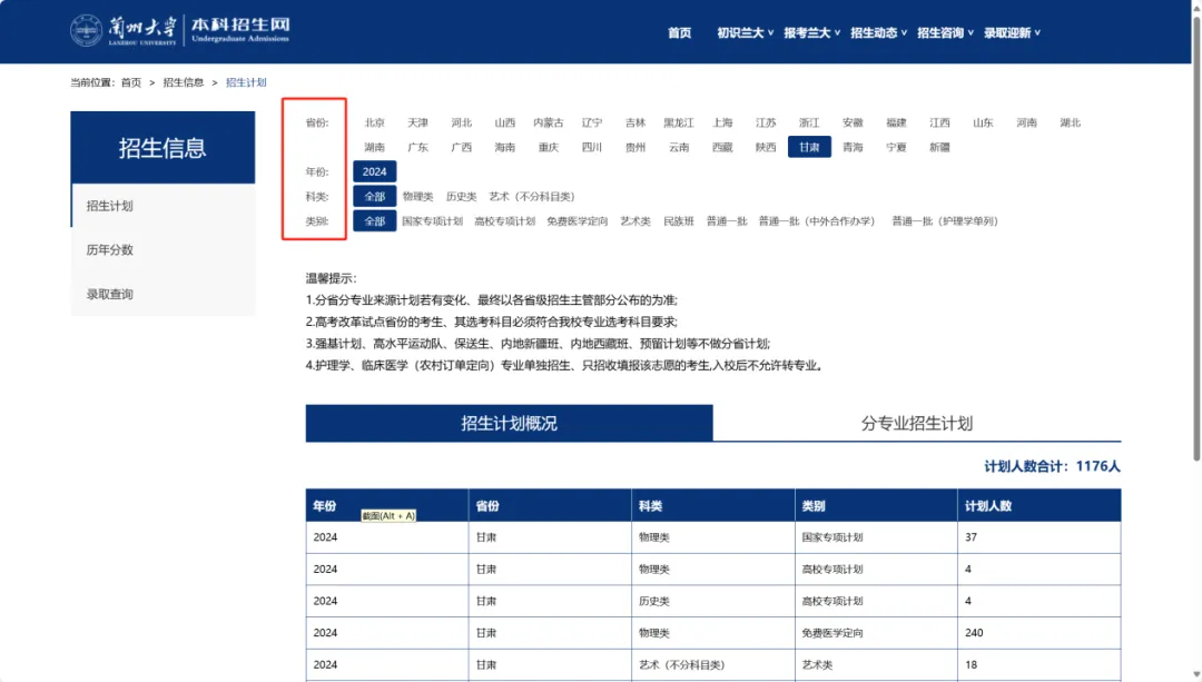 點擊底部菜單欄「報考蘭大」→「招生計劃」