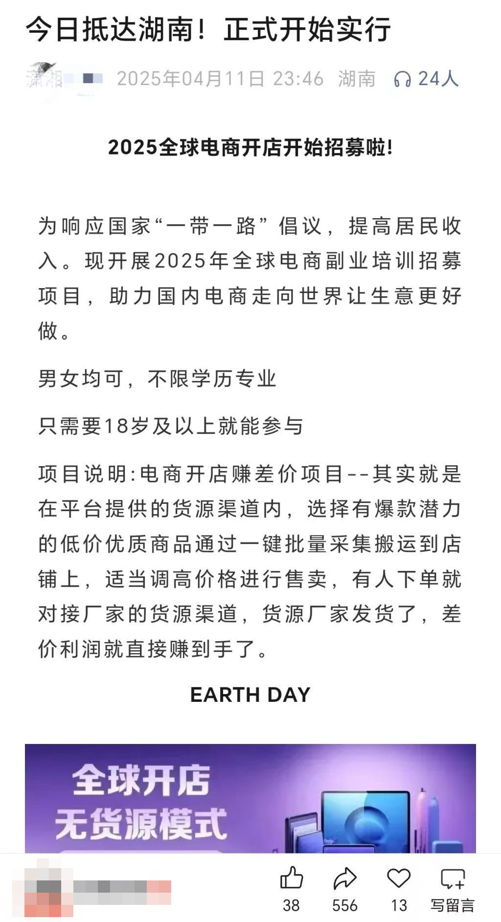 郭先生稱,今年4月11日,他關注的湖南某都市報微信公眾號發布了一篇題為《今日抵達湖南!正式開始實行》的文章,文章介紹了一個“2025年央企電商副業培訓招募項目”,項目宣稱“全球開店”“無貨源模式”“一件代發輕松創業”“可月入2萬+”。文章解釋稱“電商開店賺差價項目就是在平臺提供的貨源渠道內,選擇有爆款潛力的低價優質商品通過一鍵批量采集搬運到店鋪上,適當調高價格進行售賣,有人下單就對接廠家的貨源渠道,貨源廠家發貨了,差價利潤就直接賺到手了?!?/p>