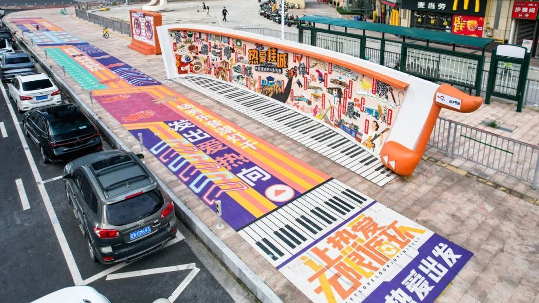 來到京華廣場西側人行道上繪制了“向熱愛出發”大型地漆彩繪,面積達360平方米。 “讓熱愛無限循環”“向熱愛出發”等文案結合琴鍵造型的彩色起跑線,代表這段音樂熱愛之旅的開端。