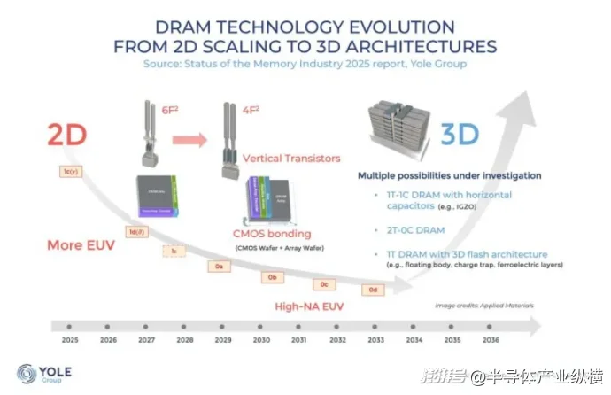 最終,預計DRAM路線圖將在2033-2034年左右向3D架構靠攏。包括三星、SK海力士、美光科技等在內的所有主要IDM都在積極研究多種架構路徑,如采用橫向取向電容器的1T-1C單元,以及無電容的替代方案,如增益單元(2T0C)和基于浮動體的1T-DRAM設計。同時,領先的半導體設備供應商——應用材料公司、Lam和東京電子——正在開發專門的工藝解決方案,以應對3D DRAM集成的獨特制造挑戰。