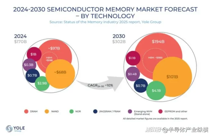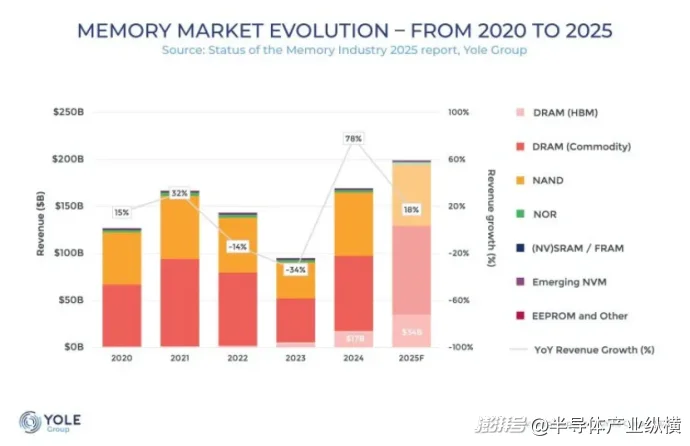 根據Yole Group的《2025年存儲行業現狀報告》,全球存儲收入在2024年達到1,700億美元(同比增長78%),并有望在2025年再增長18%,達到2,000億美元。DRAM在規模和增長潛力方面繼續領先,而高帶寬存儲器(HBM)正成為這一轉型的焦點。