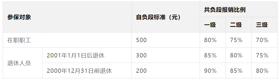 *2025職工醫保年度,在職職工和退休人員門急診自負段標準和共負段報銷比例仍按照2024年度標準執行,不作調整,具體如上表。