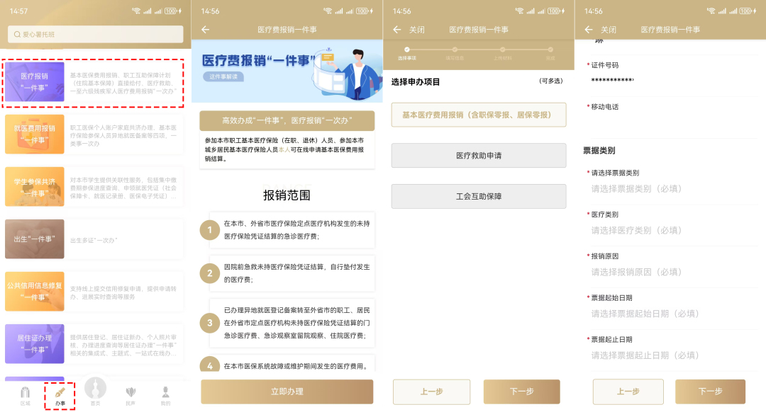 服務入口:登錄“隨申辦市民云”APP→點擊“辦事”頻道→點擊“醫療費報銷一件事”進入服務頁面。根據頁面要求確認、補充個人基本信息、選擇受理中心,填寫物流信息、確認票據并提交后,即完成線上報銷申請。