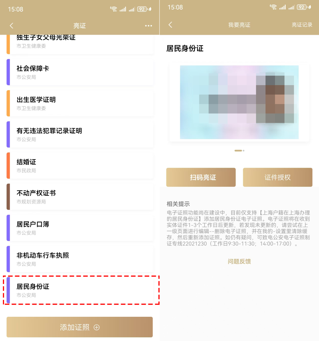 第二步:添加完成后,返回上一頁→點擊“居民身份證”,進入亮證頁面。