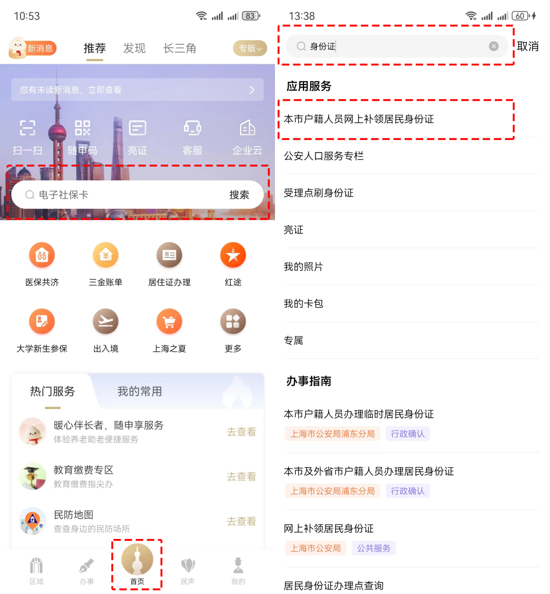 第一步:登錄“隨申辦市民云”APP→首頁搜索關鍵字“身份證”→點擊“本市戶籍人員網上補領居民身份證”進入服務