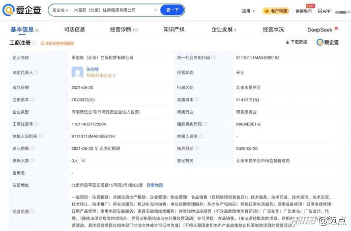 近些年,關(guān)于小米要布局長租公寓的新聞不少。2014年,雷軍旗下的順為資本向YOU+國際青年公寓投資了1億元人民幣;2021年,小米斥資7億元成立了全資子公司米公寓(北京)商業(yè)運營管理有限公司,正式涉足長租公寓業(yè)務(wù)。(近期,該公司更名為米星辰(北京)住房租賃有限公司,同時經(jīng)營范圍發(fā)生變更。)