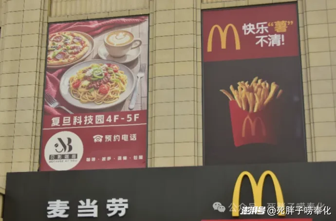 也不知道是不是天意,貝影復旦店樓下新開了一家麥當勞,兩家的巨幅廣告就這樣并排列著。
