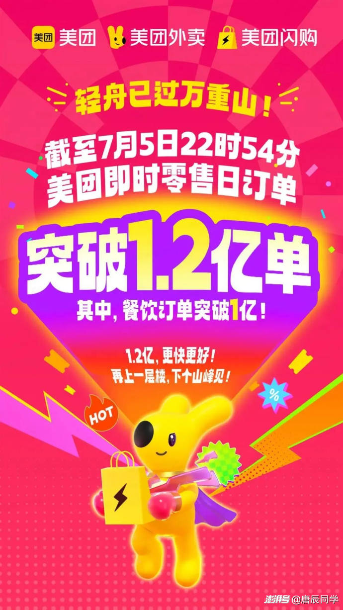 另外一個是和美團比。美團內網公布信息顯示,截至7月5日22時54分,美團即時零售當日訂單已經突破了1.2億單,其中,餐飲訂單已超過1億單,占比超過80%。
