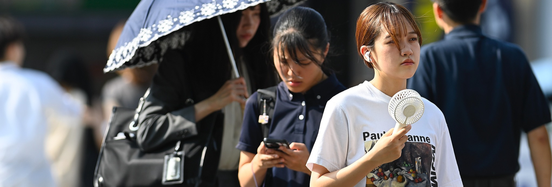 當地時間2025年7月9日,日本東京持續高溫,人們在街頭打傘躲避陽光,用風扇納涼。