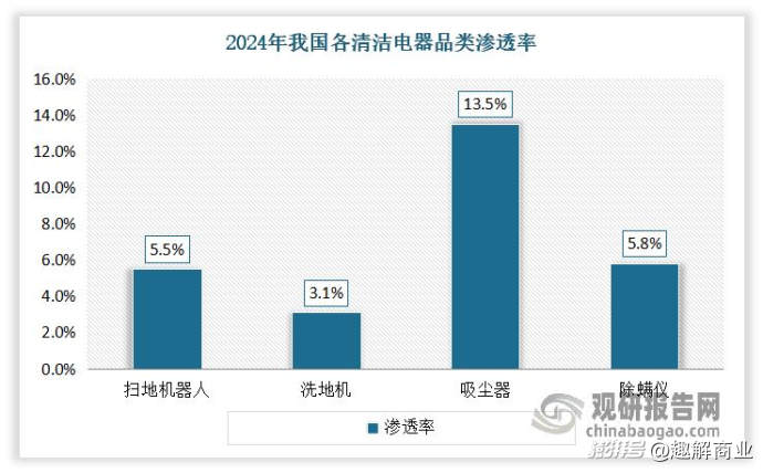 家電行業(yè)分析師劉步塵認(rèn)為,雖然洗地機(jī)近年來增速迅猛,但本身不是一個(gè)規(guī)模市場?!坝^研天下”發(fā)布的《中國洗地機(jī)行業(yè)發(fā)展深度分析與投資前景預(yù)測》顯示,2024年中國洗地機(jī)的滲透率約為3.1%,相比吸塵器這類有著十余年國民度產(chǎn)品的13.5%的滲透率,洗地機(jī)的普及和推廣仍有不少提升空間。