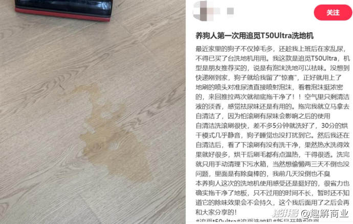 “趣解商業(yè)”注意到,不止一個(gè)用戶在使用過追覓機(jī)械臂洗地機(jī)后表示,清潔能力真的進(jìn)入了下一個(gè)“Level”,“地上的頭發(fā)再也不纏繞了”“家里寵物的尿漬終于能徹底洗干凈了”。