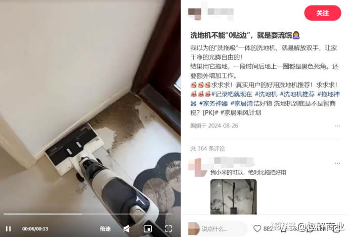 小紅書上曾有網(wǎng)友吐槽,每次用一款洗地機(jī)拖完地后,墻邊都會留下一列黑色的污水漬,每次都要進(jìn)行二次清潔,徒增的工作量一度令人十分頭疼。