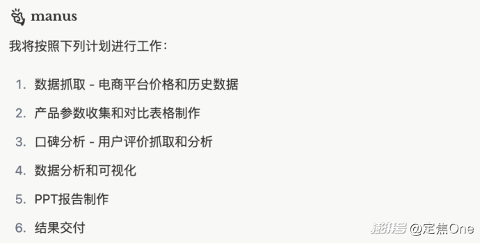 為了感受它目前的真實能力,「定焦One」為基礎版Manus設計了兩個任務:一個貼近普通人的生活場景,一個偏向專業領域,正好能看出Manus在不同場景下的表現。