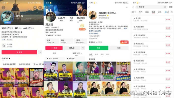 截至2025年7月,周X強(qiáng)的抖音主賬號積累了665.1萬粉絲,快手主賬號擁有333.5萬粉絲。在抖音平臺上,周X強(qiáng)的多個藍(lán)V認(rèn)證賬號粉絲量在10萬至390萬不等。其微信視頻號也保持著每日更新三次的高頻率。在小紅書上,與“周X強(qiáng)”相關(guān)的話題,高達(dá)1.3億瀏覽量。