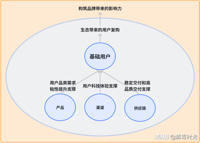 小米的發展一直沿襲著互聯網企業的思路,通過擴大用戶基盤和提升用戶粘性來不斷的提升規模和盈利。由此也很容易總結出小米生態的基本邏輯:圍繞用戶生態持續擴增為核心,兩條路徑增長——品類路徑和忠誠度圈層路徑(擴大基盤+提升復購),用戶規模是支撐硬件銷量和營業額增長,以及實現互聯網業務流量變現的核心;借助用戶生態的擴增占領不同的“生態位”,進而豐富品牌生態和實現品牌高端化;最后產品、渠道、供應鏈生態作為用戶生態持續擴增的重要支撐。