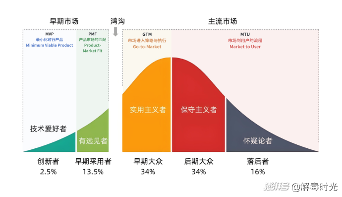 基于這種劃分,在行業階段的發展中:MVP階段就對應著創新者為主導的階段,他們樂于接受即便是不那么完美的新產品;PMF階段則是早期采用者主導的階段,這個時候產品日趨成熟,這部分用戶也異常活躍;當產品跨越鴻溝,就要進入商業化的GTM階段,如何通過營銷贏得大量的實用主義早期大眾,是重要的課題;最后針對保守主義和懷疑主義的用戶,則需要通過MTU的過程來不斷地轉化。