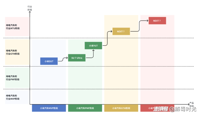 如果將小米的發展歷程中的各種能力抽象出來的話,就可以發現在SU7發布的階段,小米已經具備了很強的MVP能力(雖然不是在汽車領域),同時GTM和MTU也是行業內絕對頂尖的水平。這其實對4M模型提出了一個全新的挑戰:如果4M可以代表行業發展、企業發展以及一個產品發展的順序,但如果出現行業階段、企業能力和產品階段錯配的情況,該如何運用這個模型進行分析?