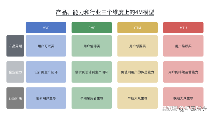 其中MVP可以看作從最基礎的產品功能入手,為用戶設計和制造出一個“可以買”的產品;而PMF則更進階到,通過對用戶需求洞察,為一部分有規模的用戶量身定制他們需要的產品,也就是設計并制造出用戶“值得買”的產品;前兩步圍繞著需求-設計-生產這些要素,第三步則要進入商業世界,通過GTM將產品真正導入到市場,通過營銷使其成為用戶知道并“想要買”的產品;而最后一步MTU是讓用戶在購買使用之后,通過體驗服務,對產品的評價為“推薦買”。