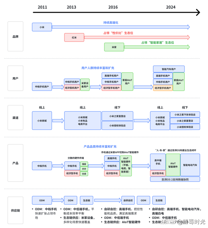 從這樣的視角來看,2013年前,小米基本就聚焦在智能手機業務,而后的十年左右時間,也就是在2024年前,逐步形成了智能手機+IoT與生活消費產品+互聯網服務(軟件)業務模式,而在2024年發布了SU7之后,拼上了新的一個版圖,即智能汽車。