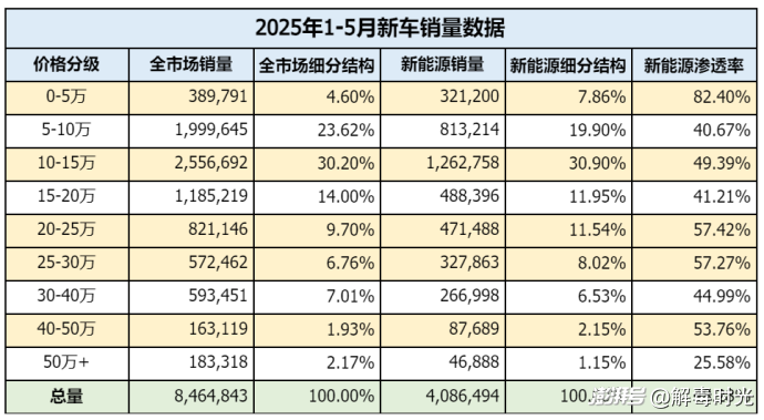 不過市場并不是均勻分布的,如果按照價格段的角度來打開銷量數據,就會發現在0-5萬的市場里,新能源的滲透率奇高,可以說傳統油車幾乎退出了這個市場的競爭,不過這個市場的量本身就很小,下面還有所謂老頭樂和一眾九號、愛瑪的攻擊,用戶的需求也是城市或城鄉之間的200公里以內的純粹代步,小電車非常具備性價比,同時還有國家置換補貼等政策的刺激,讓新能源汽車拿下了第一個絕對優勢市場,雖然前景并不可觀。