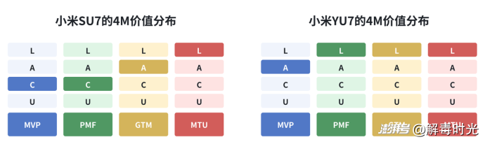 再看YU7,有了SU7的鋪墊,MVP的驗證方面可以提升到A的水平;也正是有了SU7在用戶需求方面的探索,YU7保留了絕大多數被驗證的用戶“買點”,同時再補充上全新的SUV姿態以及還算合格的空間屬性,在PMF方面可以得到L;而在SU7市場營銷戰役之后,GTM也能夠跟MTU比肩,同樣都是L了。