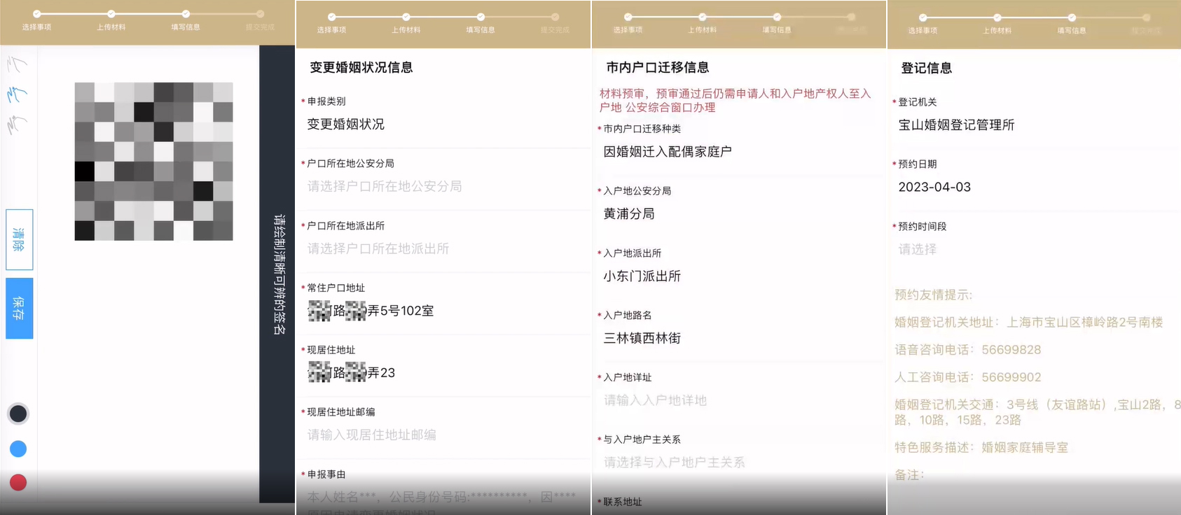 4、按照系統提示,完成電子簽名→按照系統提示,填寫本人的戶籍信息和變更婚姻狀況的申報事由→按照系統提示,填寫入戶地信息和市內戶口遷移的申報事由→按照系統提示,填寫婚姻預約所需的男女雙方信息、選擇婚姻預約登記的機關、預約日期、預約時間段;