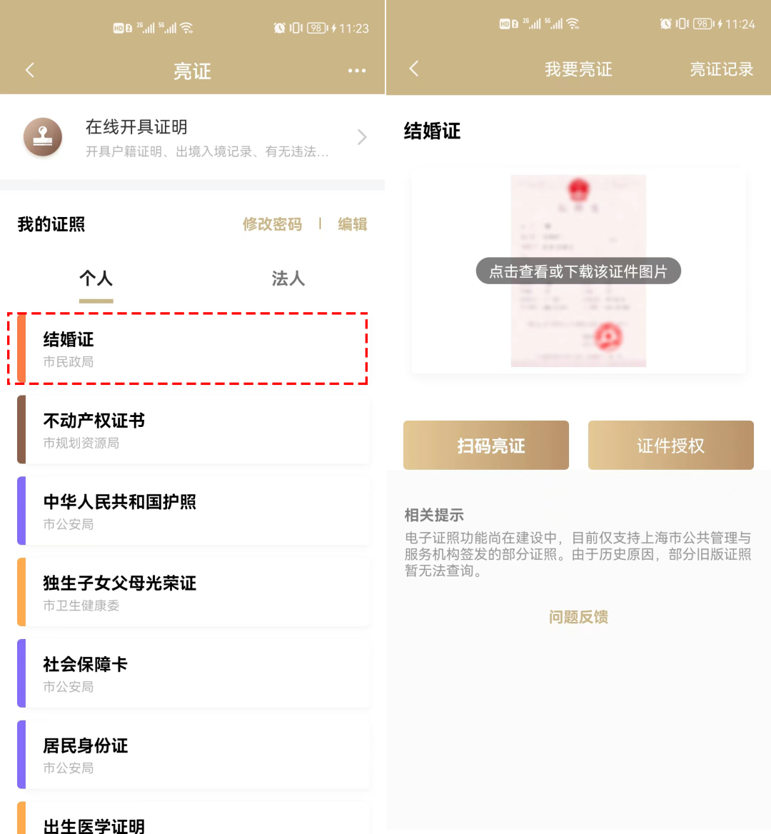 2、添加完成后,返回“亮證”首頁→點擊“結婚證”后,即可展示證件圖片,并支持掃碼亮證、證件授權、證件下載等操作。