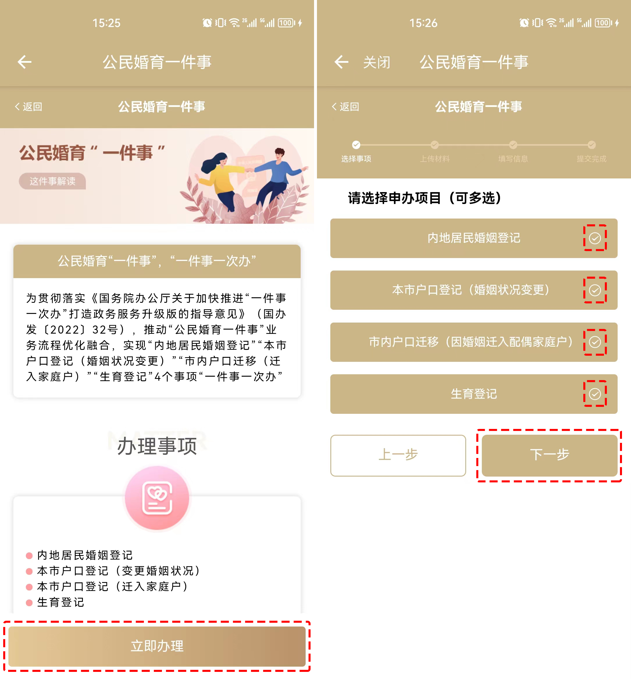 婚姻登記辦結后,按照申請人的申請,“公民婚育一件事”系統將自動把申請人填報的申請信息,推送至公安人口信息管理系統中,同時主動將衛健委生育相關信息通過頁面告知申請人。公安、衛健部門也將開展后續審核工作。
