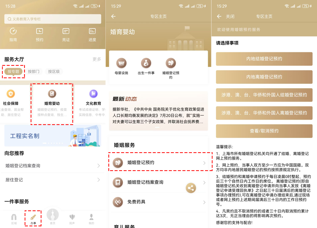 今天(5月9日)8時起,準新人們可以通過“隨申辦市民云”APP“婚姻登記預約”等線上平臺預約登記席位。
