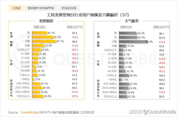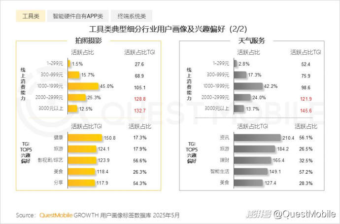 QuestMobile數據顯示,拍照攝影類媒介活躍用戶對健康、旅游興趣偏好更強,與健康生活、戶外出行場景息息相關。