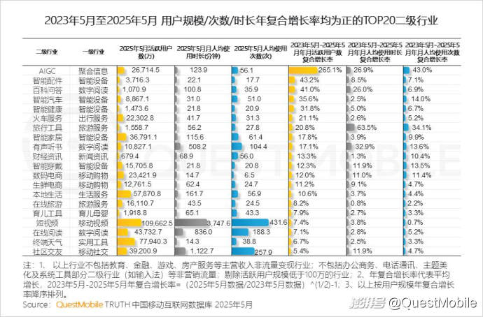 具體來看,技術的持續演變效果顯著,除了AI帶來DeepSeek、豆包用戶量和粘性的跨越式發展,智能硬件賽道的變化也非常明顯。以2025年5月為例,智能硬件自有APP流量TOP 10 APP月度活躍用戶規模和月度人均使用次數分別達到2.28億、30.4次,對比之下,在2023年5月,這兩個數字分別為1.67億、22.1次,兩年時間增長了三成以上。