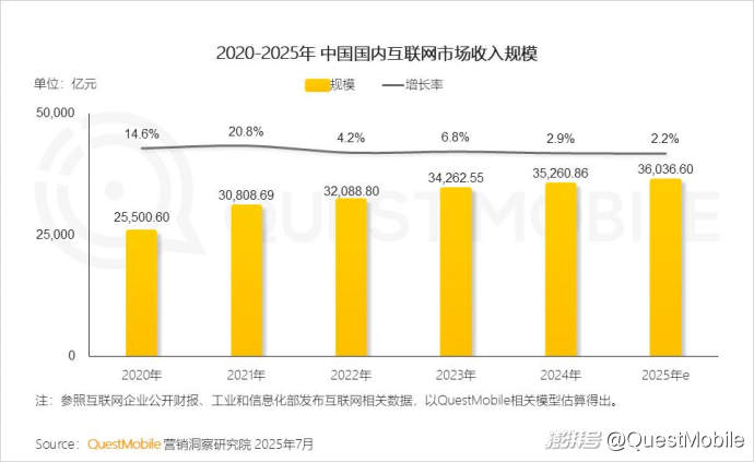 QuestMobile數據顯示,過去幾年,中國互聯網市場收入規模經歷了從雙位數增長下滑至個位數直至2%左右的過程,從絕對數值上看,2020年2.55萬億,到2024年3.52萬億,預計2025年將達到3.60萬億,這當中,互聯網廣告占比預計將達到24.9%。