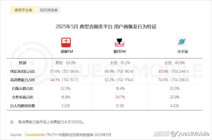QuestMobile數據顯示,2025年5月,喜馬拉雅、小宇宙音頻平臺用戶在6-10點間活躍度高,覆蓋清晨喚醒場景和通勤場景,與長視頻平臺形成補充。