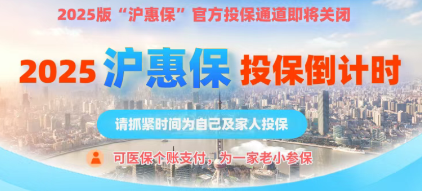 2025版“滬惠保”及“滬惠保-特定疾病保險”參保期限將于2025年7月31日關閉投保通道!請尚未參保的市民抓緊時間,通過官方投保通道“隨申辦市民云”APP,即可使用醫保個人賬戶參保,為自己和家人備好一整年的健康保障!