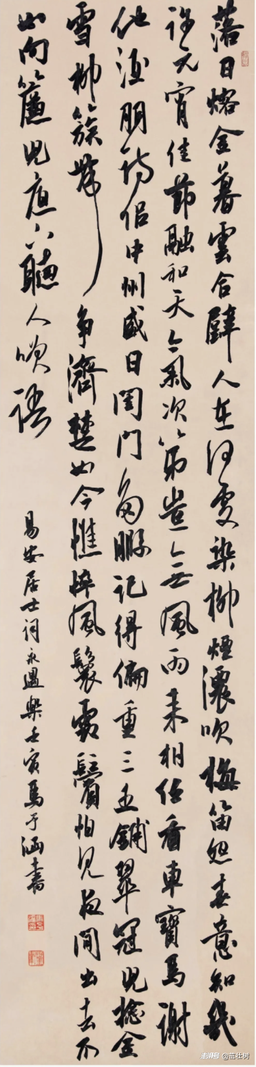 另外落款比較靠中,下面留出的白和上面留出的白有點相似。現在對于落款的審美一般要求偏高一點,就像人一樣,有種“提氣”之感,上身短下身長,也符合人體審美的要求。所以,這幅作品的落款可以向上挪一點,如果左邊寫不下,可以破邊寫到外面去一點沒關系,下面再進來。像現在落款這樣的布局,下面這枚章就顯得多余了。這個章不應該敲,因為本來就有點擠。