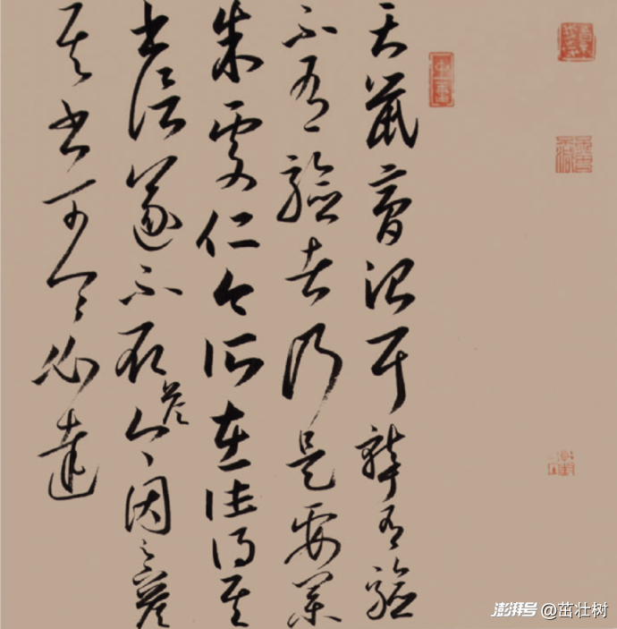 大篆很多來源于古代青銅器上的銘文,古人其實已經把文字寫得很優美了,我們今天再來書寫,就要寫出金石氣,寫出古拙的味道。這幅作品的落款是章草,缺點是寫得偏大了。